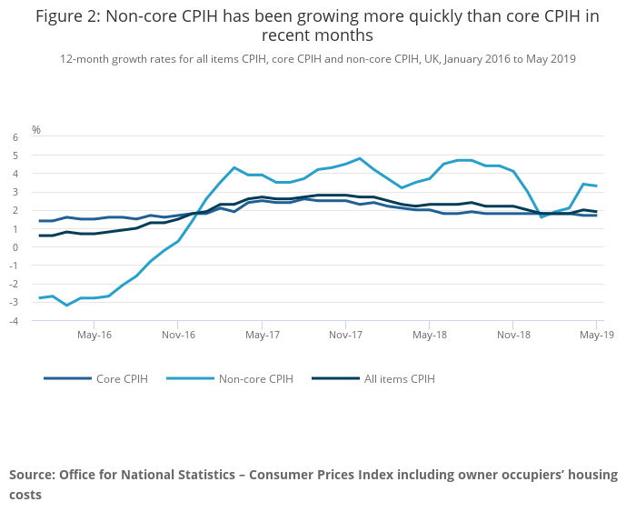 Over recent months, core inflation has been relatively flat, with the 12-month growth rate staying at 1.8% from September 2018 to March 2019 before falling slightly to 1.7% in April and May 2019. By contrast, the 12-month growth rate of non-core CPIH has risen sharply in recent months, from a low of 1.6% in January 2019 to 3.4% in April 2019. This follows a period of falling growth in the non-core series, however, reflecting the underlying volatility of non-core components.
