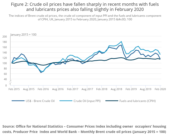 Prices for the crude oil component of input PPI and the fuels and lubricants component of CPIH both fell between January and February 2020, reflecting a fall in global prices for crude oil.