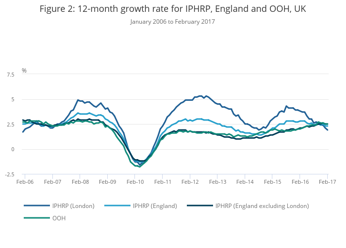 To further understand the movements in the OOH component, Figure 2 plots the 12-month growth rate for the Index of Private Housing Rental Prices (IPHRP) against the OOH component of CPIH. The IPHRP measures the change in price of renting residential property from private landlords. It uses the same source of rental data as OOH but the weights used to create the different series are designed to reflect the different housing mix that can be found in the private rental market compared with the owner-occupied market.