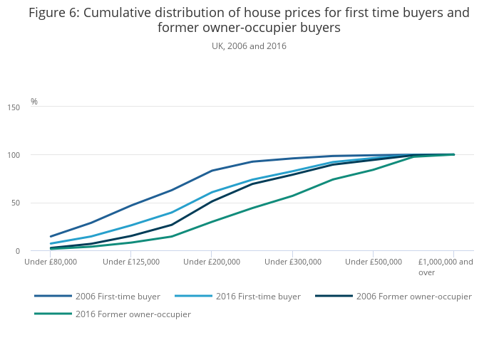 Figure 6 shows the cumulative percentage of house buyers, using a mortgage, by the price they paid in 2016 compared with 2006. House buyers are categorised into first-time buyers and former owner-occupier buyers.