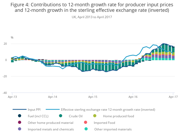 Figure 4 shows that input producer prices have grown by 16.6% between April 2016 and April 2017, the third consecutive month of slower growth. This has coincided with a relative strengthening of the sterling effective exchange rate since October 2016 (shown as a downward movement in the inverted exchange rate 12-month growth rate in Figure 4), which is now around 7.8% lower than in April 2016.
