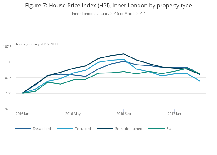 Image .csv .xlsThese data show that average prices in Inner London for detached, semi-detached and terraced houses grew by around 5% to 6% from January 2016 until September 2016. Since then, prices have fallen back for these types of property but remain around 2% to 3% higher than in January 2016 in the latest period (March 2017). The average price for flats in Inner London has seen more steady growth over the period and is now also around 3% higher than it was in January 2016. The sharpest fall is seen in the latest period, although these estimates could be revised as more data become available in future months1.