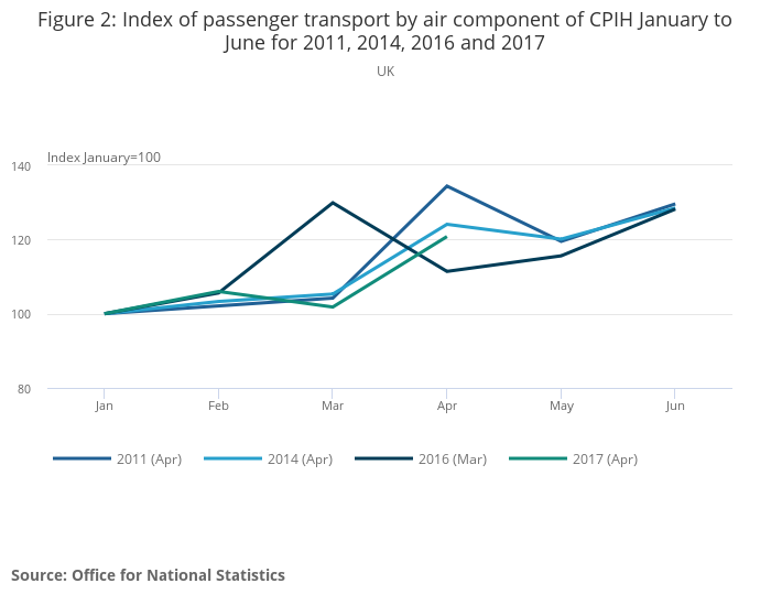 Rising air fares were the main contributor to the increase in the 12-month rate of the Consumer Prices Index including owner occupiers’ housing costs (CPIH) between March 2017 and April 2017. In turn, this is largely due to Easter falling later in 2017 compared with 2016.