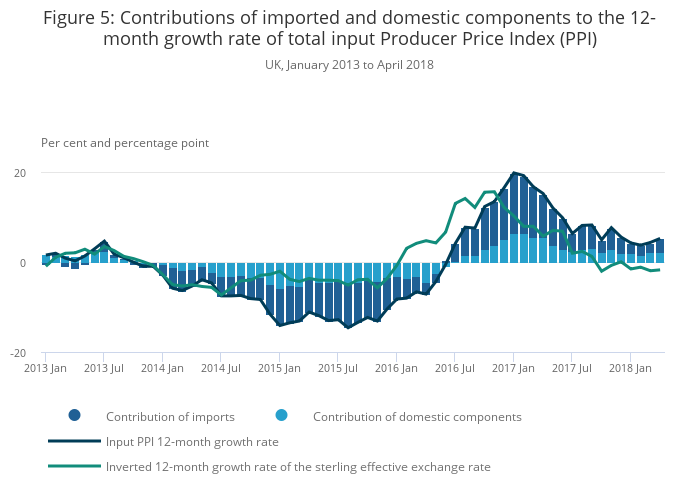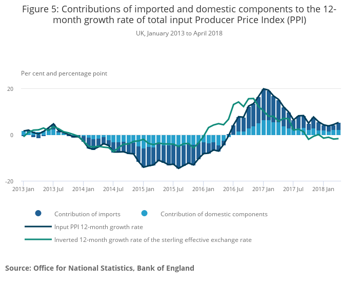 Figure 5 shows the 12-month growth rates for the input Producer Price Index (PPI) and the contributions made by imports and domestic components respectively, as well as the inverted sterling effective exchange rate.