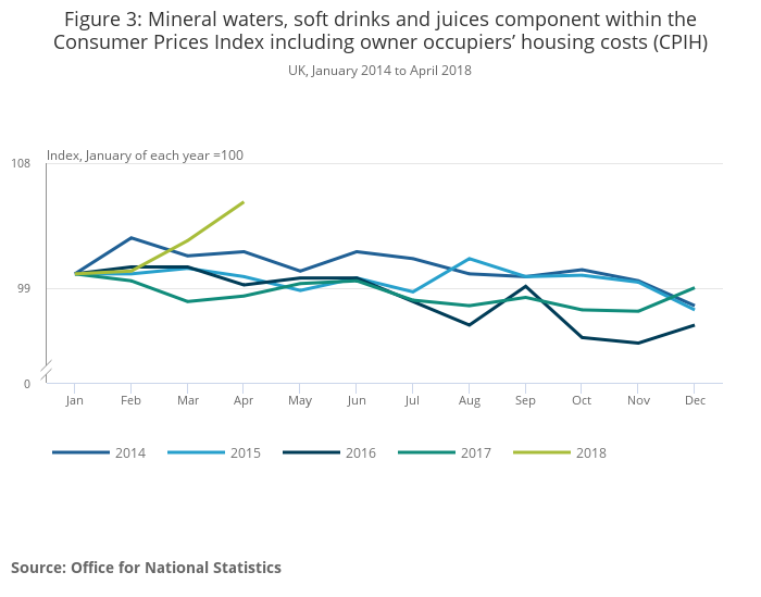 - Prices for the mineral waters, soft drinks and juices component of CPIH rose sharply in March and April 2018