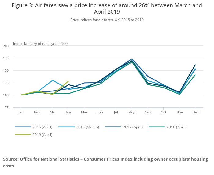 Air fares contributed strongly to the change in the 12-month growth rate of CPIH between March and April 2019, as Easter, falling towards the end of April, affected April prices.