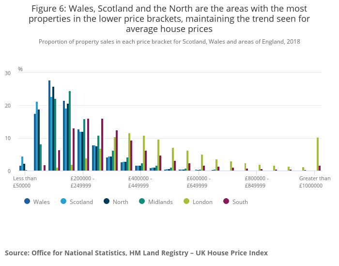 Figure 6 splits out property transactions by £50,000 price brackets and shows what proportion of transactions for each country and area of the UK fell into each price bracket in 2018. This allows us to see how the distribution of property values varies across the UK.