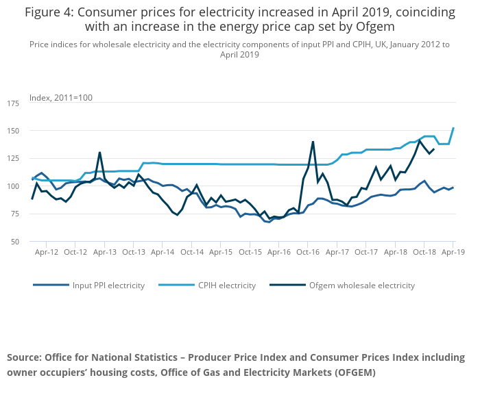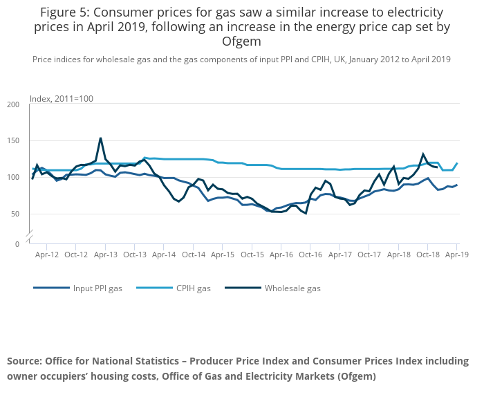 - Consumer prices for electricity and gas rose more sharply than producer prices in April 2019, as the Ofgem price cap also rose