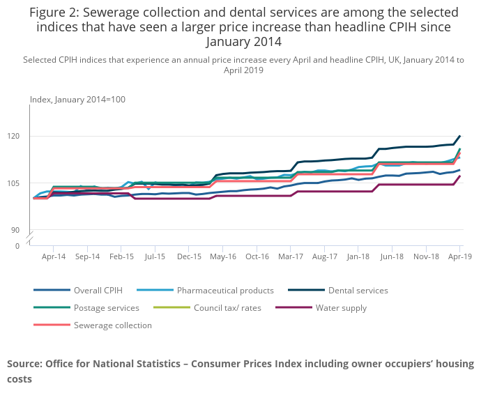 A number of goods and services saw an annual uplift in prices in April 2019 but this had a limited impact on the growth rate of CPIH as it was of a similar scale to previous years.