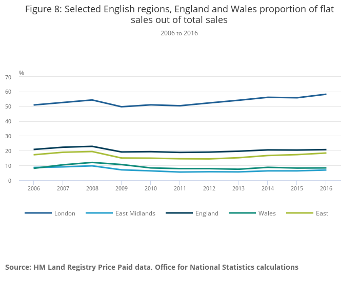 Figure 8 shows flat sales as a proportion of all property transactions in England, Wales, London, East of England and the East Midlands between 2006 and 2016. The share of flat sales in London is much higher than England as a whole at nearly three times the proportion, given the structure of the property market in the capital. Wales and the East Midlands have the lowest share of flat sales each year, and the East of England is close to the England average.
