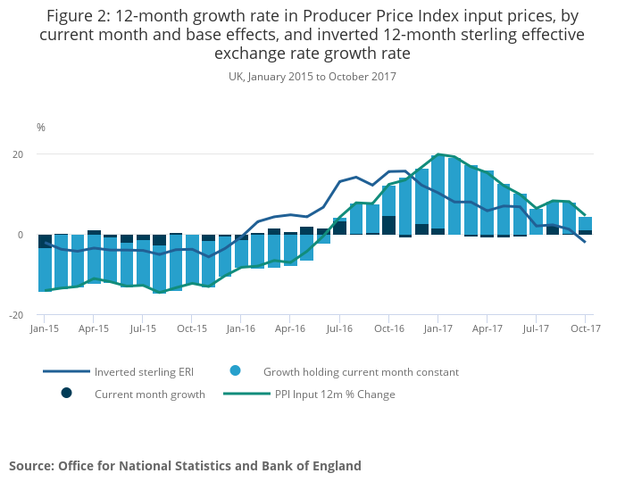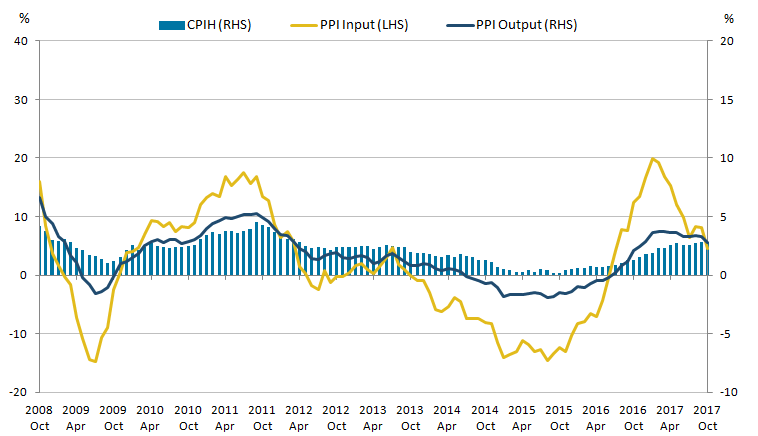 Figure 1 shows the 12-month growth in the Consumer Prices Index including owner occupiers’ housing costs (CPIH) remained unchanged at 2.8% in October 2017. The input Producer Prices Index (input PPI) grew by 4.6% in the 12 months to October 2017, down from 8.1% in the 12 months to September 2017. The output Producer Prices Index (output PPI) grew by 2.8% in the 12 months to October 2017, down from 3.3% in the 12 months to September 2017.