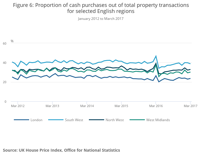 - New data on cash and mortgage transactions for purchases of property shows that London has the smallest share of cash purchases at around 25% of all transactions and the South West has the greatest share at around 40%.
