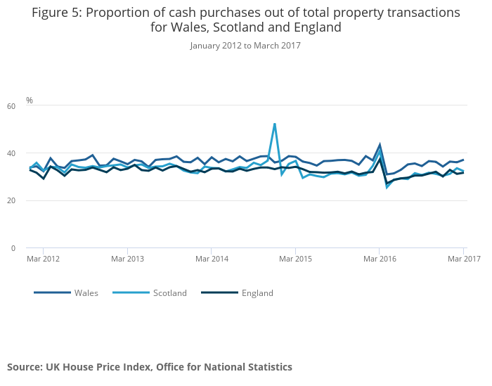 The UK House Price Index has for the first time published data on the number of property transactions purchased using either cash or mortgages for Great Britain since January 2012. Figure 5 shows the percentage of cash purchases as a proportion of total sales volumes for England, Scotland and Wales from the start of the series until March 2017. The latest three months of transactions data are excluded from the analysis as there is a lag in the complete data becoming available, and these months are subject to revisions.