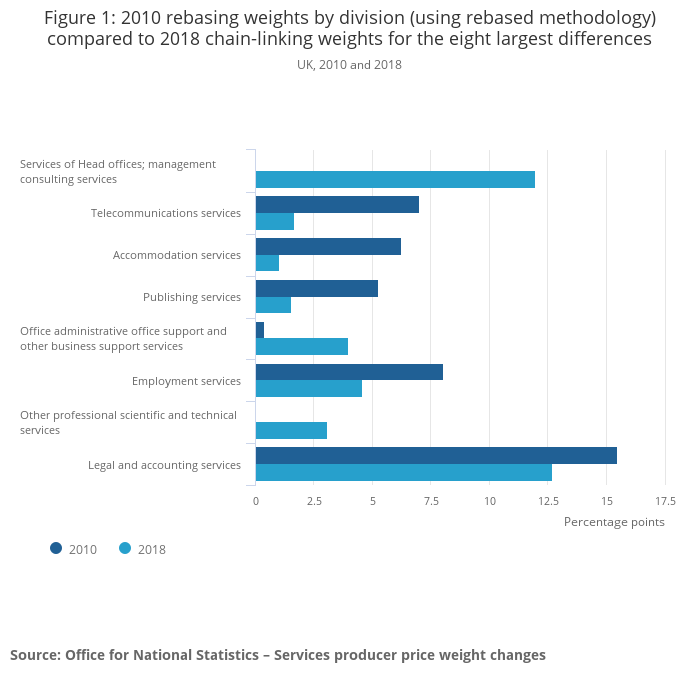 The focus of this article is on how the weights movements align to changes in the structure of the UK economy. However, some of the changes are also driven by changes in the methodologies used to calculate them. This is explored in more detail in Chain-linking in business prices and Services Producer Price Index (SPPI) method changes. Further detail on the methodology used at the last 2010 rebasing exercise is available in the SPPI Methods and Guidance (PDF, 457KB).