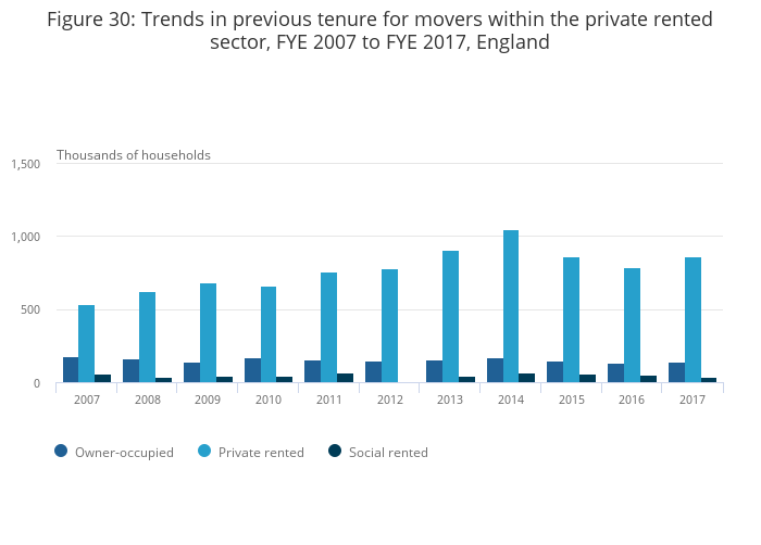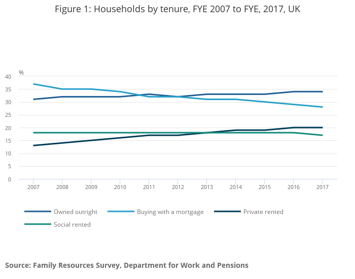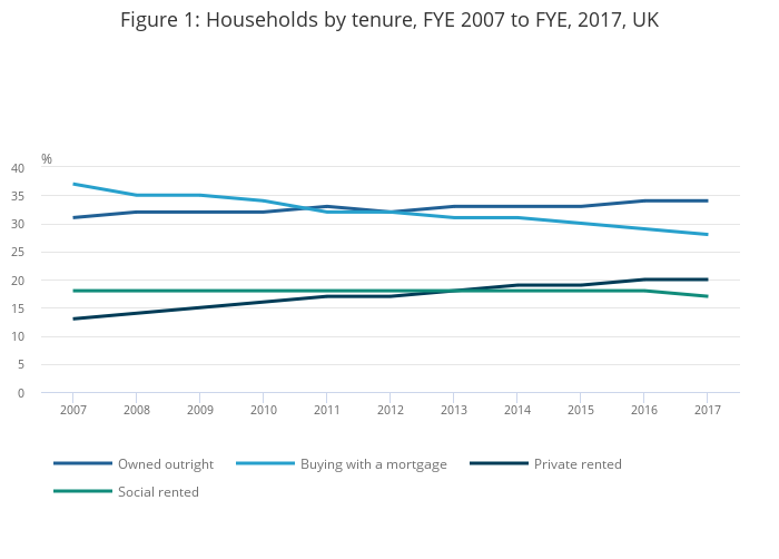 The number of households living in the private rented sector in the UK increased from 2.8 million in 2007 to 4.5 million in 2017, an increase of 1.7 million (63%). Over this period, the number of owner occupier households remained broadly consistent at 17.7 million households. However, households owned outright increased from 7.9 million to 9.4 million while households buying with a mortgage fell from 9.8 million to 8.3 million. The number of social rented households decreased by 200,000 households to 4.5 million (Annual Population Survey). The APS is not a stand-alone survey; it uses data combined from two waves of the main Labour Force survey and has a larger sample size than the FRS. It should be noted when comparing 2007 with 2017 figures that APS data from 2006 to 2011 is weighted with 2014 population estimates, while 2012 to 2017 data are weighted with 2017 population estimates.