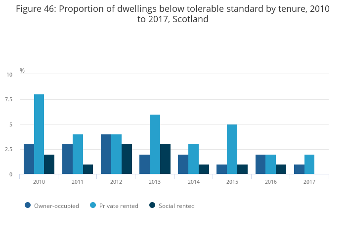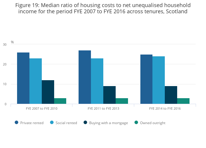 Other recent developments in Scotland include the development of additional publication commentary and analysis of households living in the private rented sector within Scottish household survey annual reports, in which the latest report for 2017 includes a new section on changes to the private rented sector between 1999 and 2017. Analysis of affordability in the private rented sector, in terms of housing costs to income ratios, has also been developed as part of new Social tenants in Scotland statistical outputs, which whilst primarily focused on social rented housing also include a range of findings across different housing tenures and Great Britain countries.