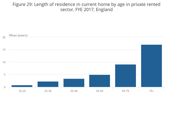 In FYE 2017, household reference persons (HRP) in the private rented sector in England were, on average, younger than social renters and owner occupiers, with a mean age of 40 years (compared with 52 years for social renters and 57 years for owner occupiers). Whilst this is broadly unchanged over the past ten years, the distribution of the sector across age bands has shifted (English Housing Survey).
