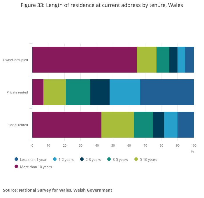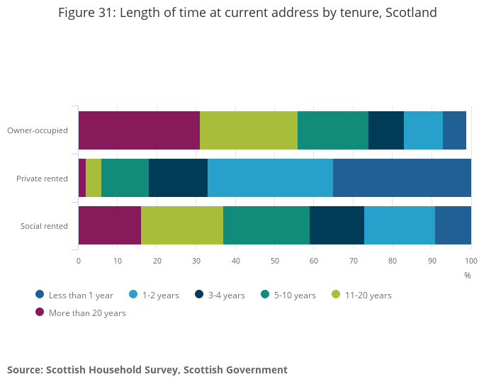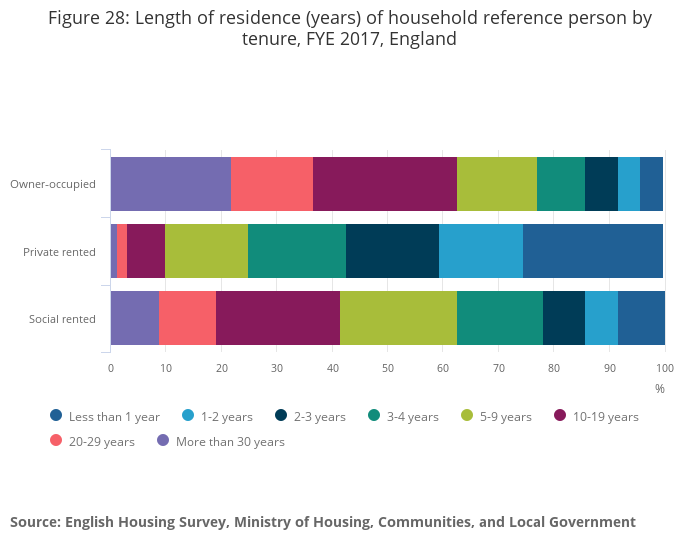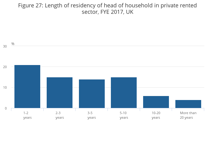 As at financial year ending (FYE) 2017, 62% of households in the private rented sector in the UK had spent under three years in the same accommodation and only a small proportion (4%) had been in the same residence for 20 years or longer.