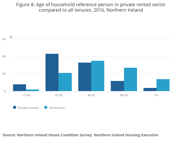 Figure 8: Age of household reference person in private rented sector compared to all tenures, 2016, Northern Ireland