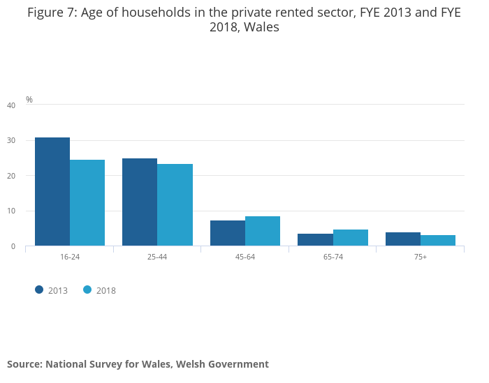 Figure 7: Age of households in the private rented sector, FYE 2013 and FYE 2018, Wales