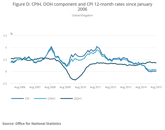 CPIH (not a National Statistic) grew by 0.3% in the year to August 2015, down from 0.4% in July 2015