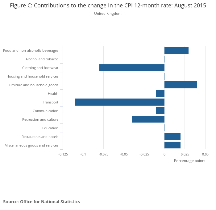 The CPI 12-month rate (the amount prices change over a year) between August 2014 and August 2015 stood at 0.0%. This means that a basket of goods and services that cost £100.00 in August 2014 would have still cost £100.00 in August 2015. This continues the trend of the previous 6 months when inflation had been at or around 0.0%.