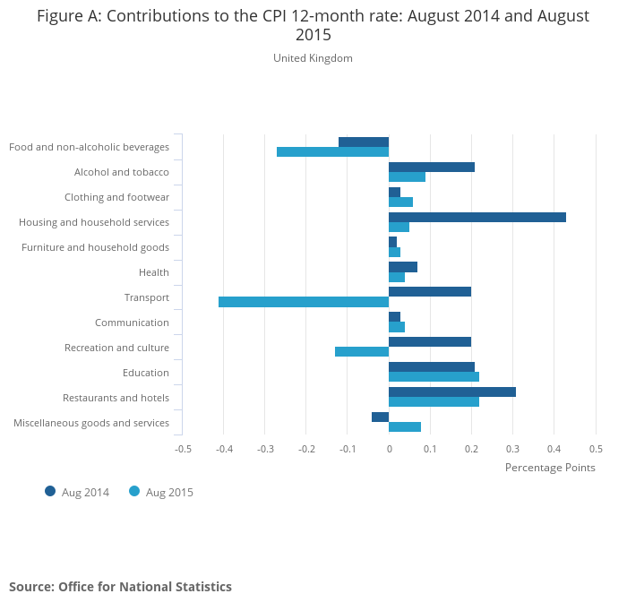 Figure A shows the contributions to the CPI 12-month rate in August 2015 compared with the contributions to the 12-month rate a year earlier. A larger version of the chart can be viewed by clicking on it (HTML version only).