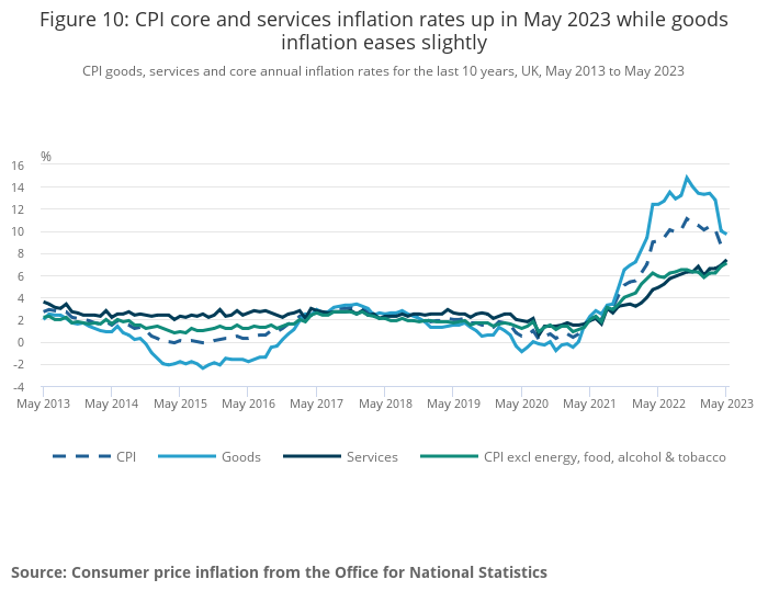 CPI goods, services and core annual inflation rates for the last 10 years, UK, May 2013 to May 2023