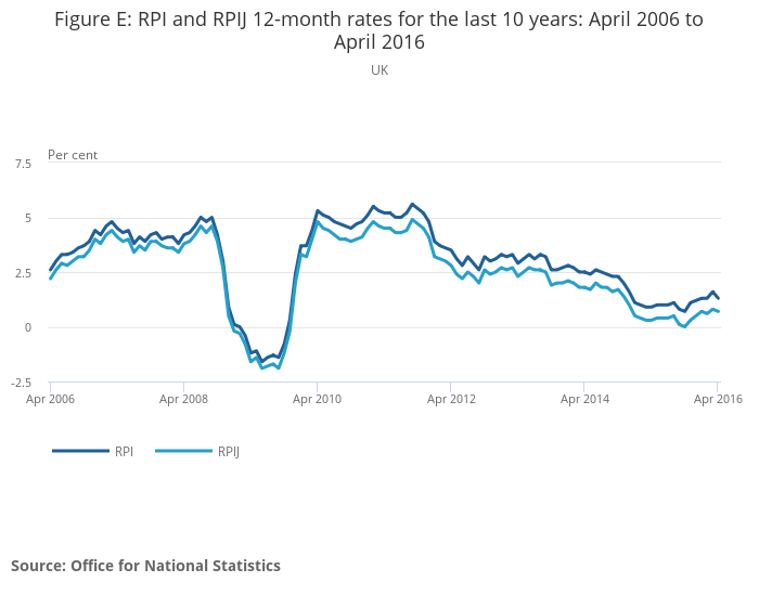 The RPI 12-month rate for April 2016 stood at 1.3%, meaning that it was 0.6 percentage points higher than it would have been had it used formulae that meet international standards.
