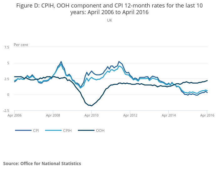 Download this chart Figure D: CPIH, OOH component and CPI 12-month rates for the last 10 years: April 2006 to April 2016