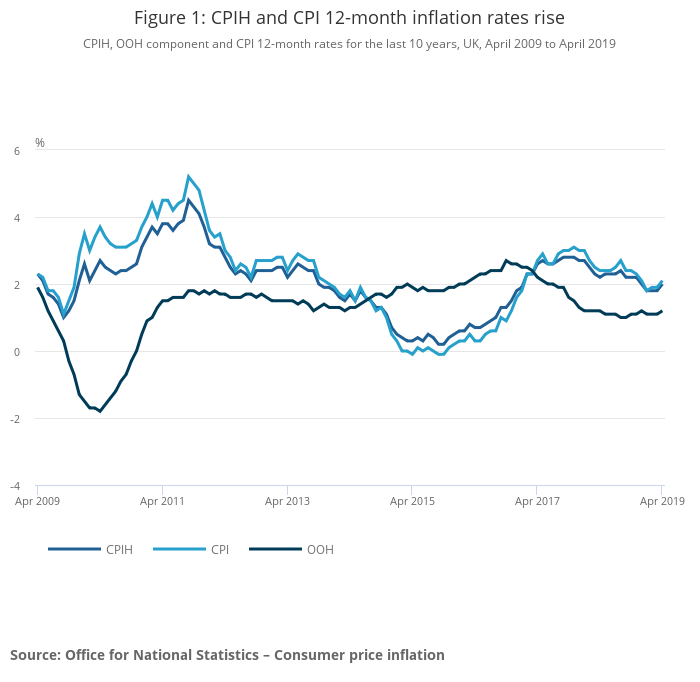 The Consumer Prices Index including owner occupiers’ housing costs (CPIH) 12-month inflation rate was 2.0% in April 2019, up from 1.8% in March 2019.
