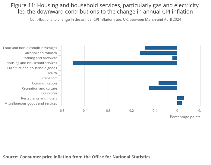 Contributions to change in the annual CPI inflation rate, UK, between March and April 2024