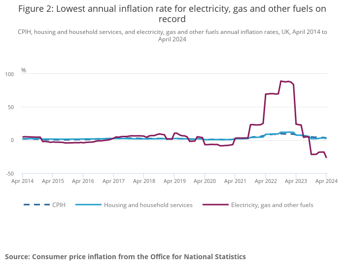 Prices of electricity, gas and other fuels fell by 27.1% in the year to April 2024, the largest fall on record, with figures available back to 1989. Gas prices fell by 37.5% on the year, compared with a fall of 26.5% in the year to March 2024, while electricity prices fell by 21.0%, compared with 13.0% in March.