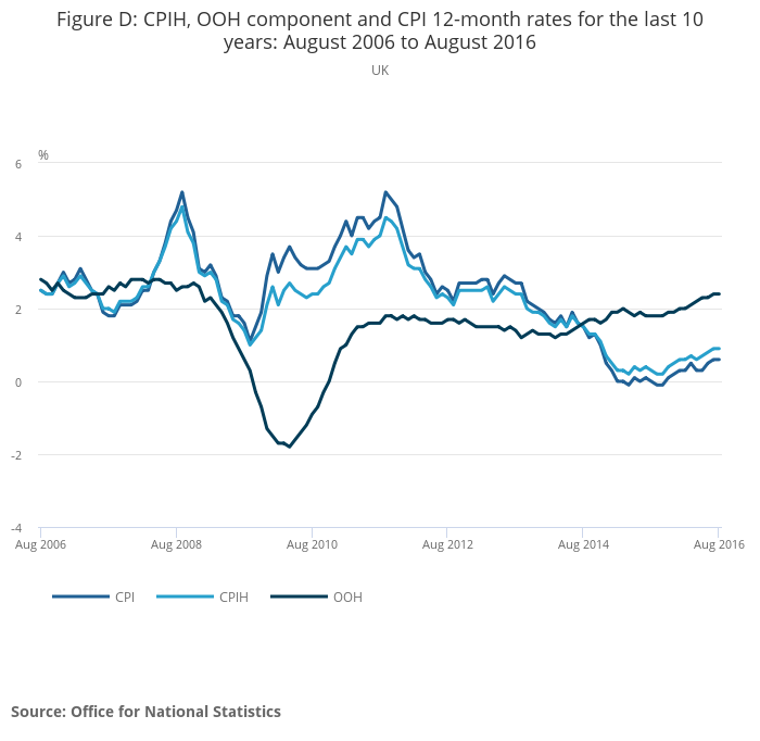 Download this chart Figure D: CPIH, OOH component and CPI 12-month rates for the last 10 years: August 2006 to August 2016