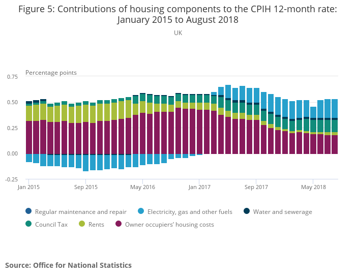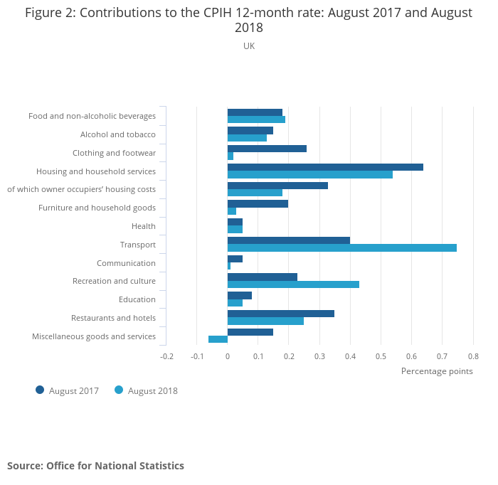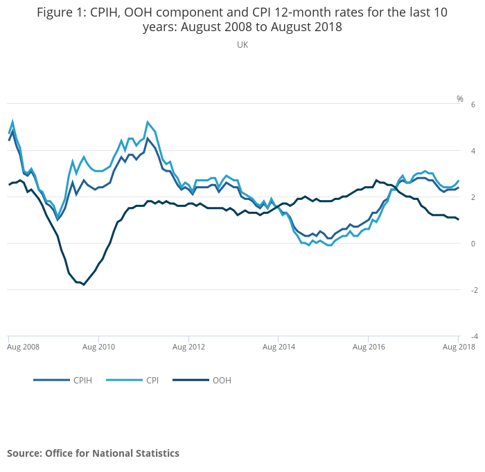 The Consumer Prices Index including owner occupiers’ housing costs (CPIH) 12-month inflation rate was 2.4% in August 2018, up from 2.3% in July 2018.