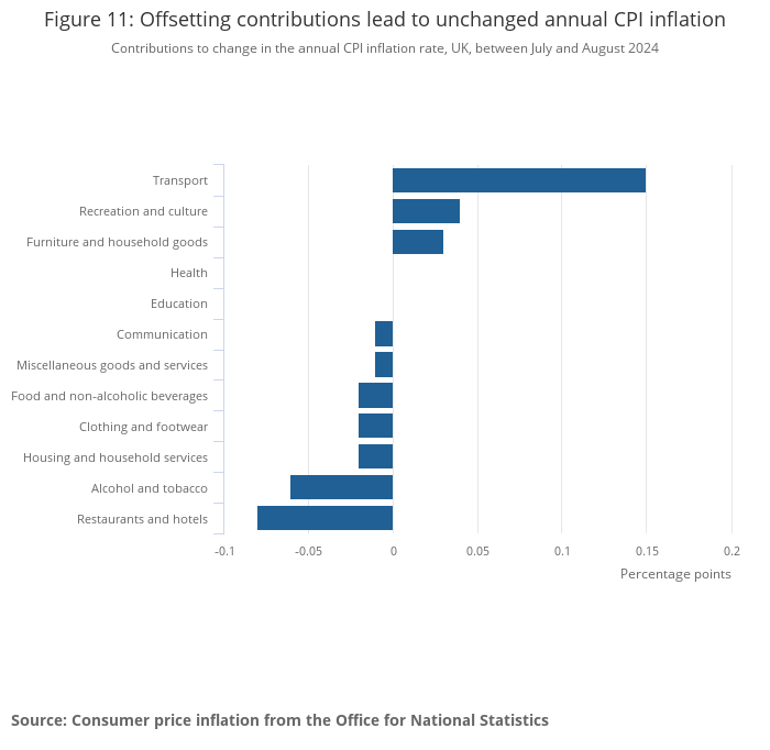 The unchanged annual inflation rates in August 2024 reflected offsetting contributions from the different product groups. There were upward contributions from three divisions, most notably transport, offset by downward contributions from seven, particularly restaurants and hotels, and alcohol and tobacco.