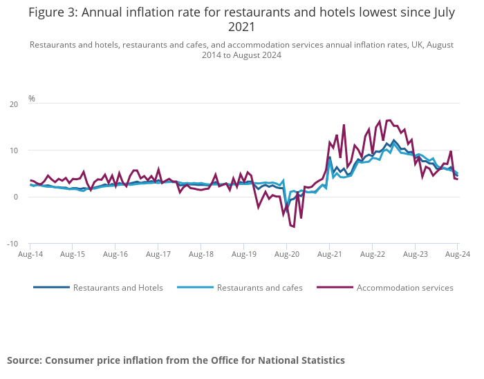 Restaurants and hotels, restaurants and cafes, and accommodation services annual inflation rates, UK, August 2014 to August 2024