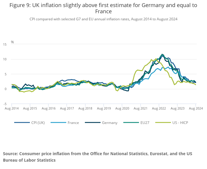 - Core CPIH (excluding energy, food, alcohol and tobacco) rose by 4.3% in the 12 months to August 2024, up from 4.1% in July; the CPIH goods annual rate fell from negative 0.5% to negative 0.9%, while the CPIH services annual rate rose from 5.7% to 5.9%.