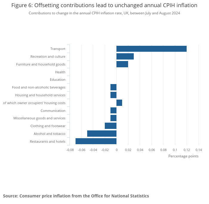 Contributions to change in the annual CPIH inflation rate, UK, between July and August 2024