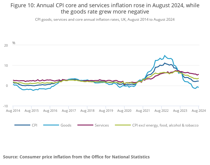 CPI goods, services and core annual inflation rates, UK, August 2014 to August 2024