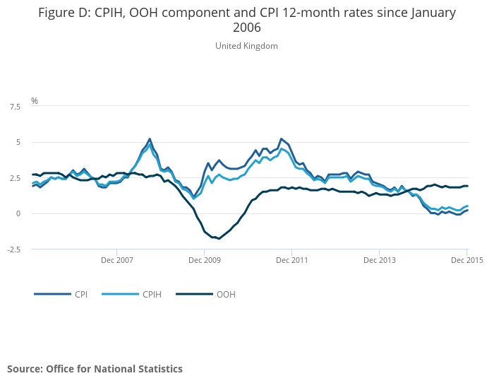 In December 2015, the 12-month rate (the rate at which prices increased between December 2014 and December 2015) for CPIH stood at 0.5%, up from 0.4% in November 2015. The difference between the CPI and CPIH annual rates in December 2015 was 0.3 percentage points, the same as the difference in November 2015.