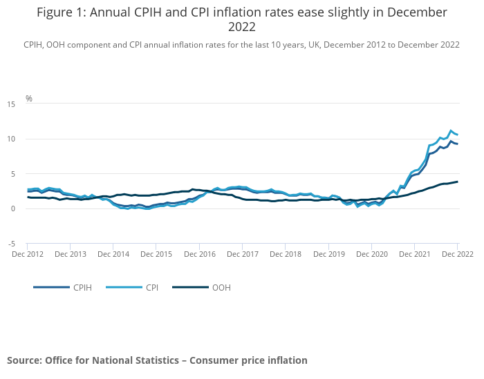 • The Consumer Prices Index including owner occupiers' housing costs (CPIH) rose by 9.2% in the 12 months to December 2022, down from 9.3% in November.