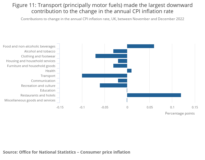 Figure 11 shows how each of the main groups of goods and services contributed to the change in the annual CPI inflation rate between November and December 2022.