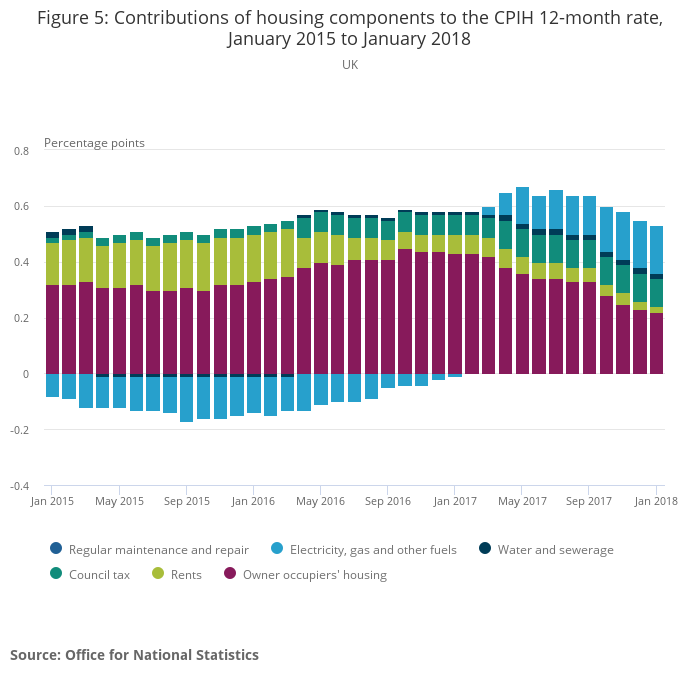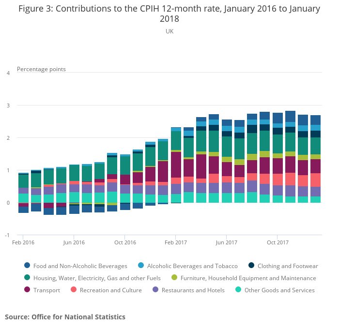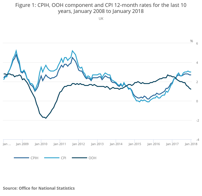 - The Consumer Prices Index including owner occupiers’ housing costs (CPIH) 12-month inflation rate was 2.7% in January 2018, unchanged from December 2017.