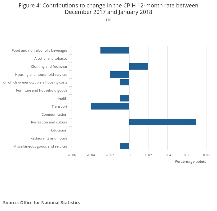 Figure 4 shows how each of the main groups of goods and services contributed to change in the Consumer Prices Index including owner occupiers’ housing costs (CPIH) 12-month rate between December 2017 and January 2018. The corresponding figures for the Consumer Prices Index (CPI) can be found in column F of Table 26 in the Consumer price inflation dataset.