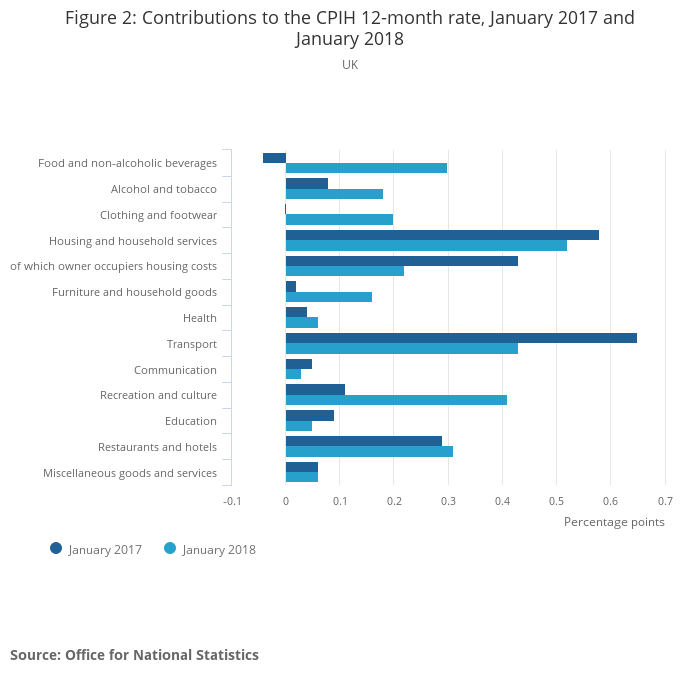 Figure 2 shows that price movements for all the broad categories of goods and services had an upward effect on the Consumer Prices Index including owner occupiers’ housing costs (CPIH) 12-month rate in January 2018, as has been the case since March 2017.