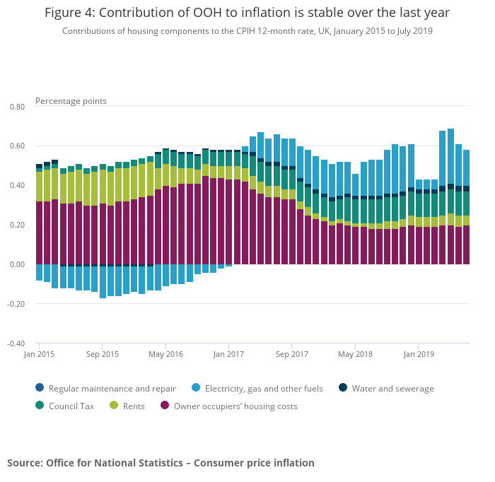 Image .csv .xlsFigure 4 shows the contribution of owner occupiers’ housing costs (OOH) and Council Tax to the Consumer Prices Index including owner occupiers’ housing costs (CPIH) inflation rate in the context of wider housing-related costs. The contribution from OOH had been on a downward trend from a high in October 2016. However, it has stabilised over the last year and was the largest contribution to the CPIH 12-month rate from all the housing and household services categories for the first three months of 2019, and for July 2019.