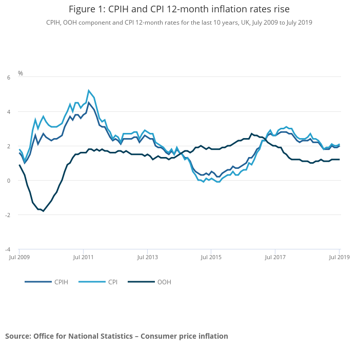 The Consumer Prices Index including owner occupiers’ housing costs (CPIH) 12-month inflation rate was 2.0% in July 2019, increasing from 1.9% in June 2019.