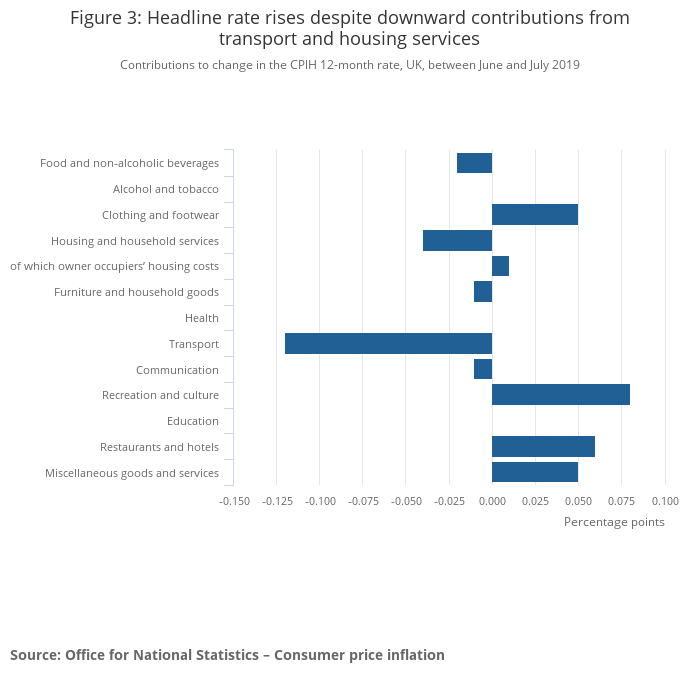 There were also large upward contributions to the CPIH 12-month rate from recreation and culture, and restaurants and hotels, where prices rose in the year to July 2019 by 2.4% and 3.1%, respectively.