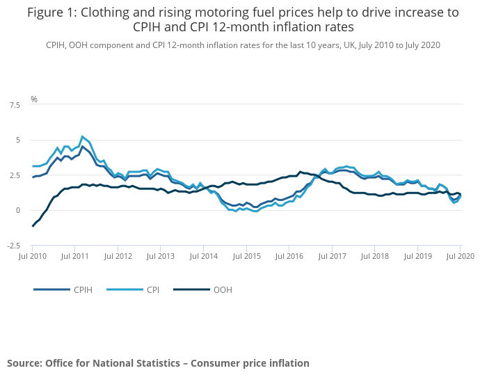 The Consumer Prices Index including owner occupiers’ housing costs (CPIH) 12-month inflation rate was 1.1% in July 2020, up from 0.8% in June 2020.